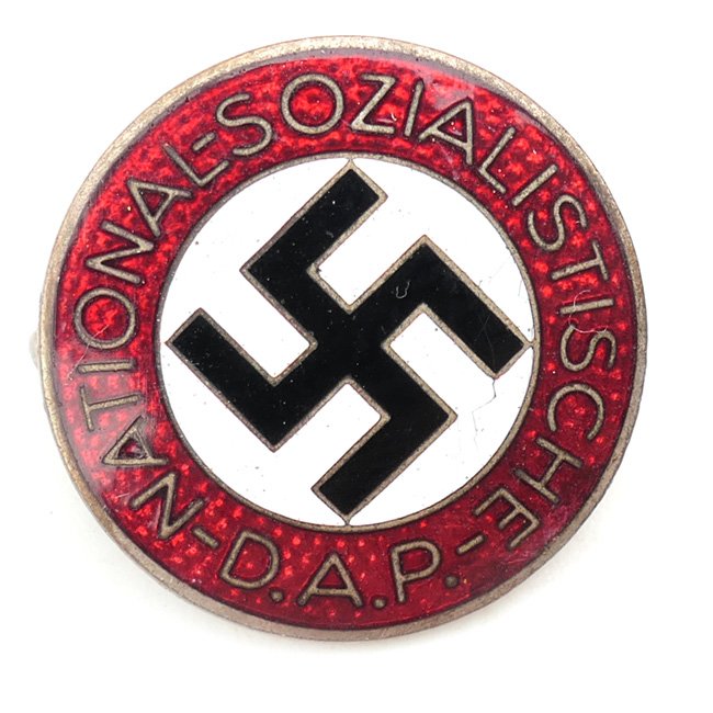 NSDAP Membership Badge (Parteiabzeichen). The badge is a nice enameled example, it has a nice age patina and has never been cleaned nor polished, the badge is showing a darkened age-patina and scratches caused by usage and wear. The badge is maker marked with RZM (Reichszeugmeisterei) 'M1/92', indicating production by the company of 'Kerbach & Israel' from Dresden. The badge is of course complete with its original functional pin/catch construction. Nice example in good used condition!