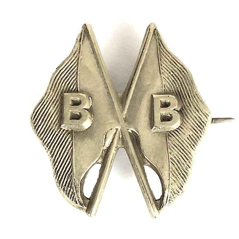 A scarce original early circa 1920's 'Boys' Brigade Signallers' proficiency badge'; die-cast silver plated example with pierced wavy crossed flags and sticks. Very good condition, complete with original axle joint pin fitting and rounded catch.Height approx 27mm.