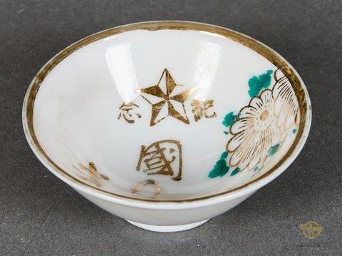 Japanese WWII Sake Cup-This cup measures 2 ¾ inches (6.985cm) in diameter. Its edges are heavily embossed in gold gilding. The cup has only gold kanji in the bowl's center as well as a very delicate floral design in green and gold. There is also a 5 pointed gold star painted within the design. It's quite pretty.This cup is unmarked. It is in excellent condition.