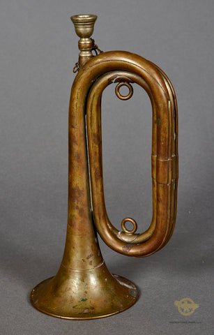 Veteran Bring Back WWII Japanese Bugle-This is produced in brass. This horn is in very good condition, with moderate denting, please be sure to look at the photos. There is moderate and green verdigris throughout the tubing but overall, this unmarked example is in very good shape. The mouthpiece is present, but unmarked as they usually are. There is a small brass chain holding the mouthpiece to the body of the horn. This is a great looking example that was brought home by a US veteran. We will supply the name of the soldier to the buyer.A great looking display piece.