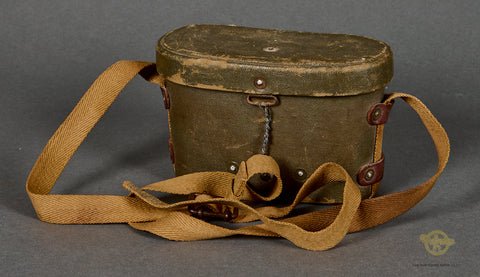 Veteran Bring Back WWII Japanese Binocular Case-This is a rubberized canvas binocular case that is green in color. This case will fit the shorter 7x7 binoculars. There is a canvas tan strap that is attached to the sides to be worn as a shoulder strap. A collector has added a wire closure to the front of this case; this is not original of course. This case is a bit salty, but if you like those items that tell a story, this is the case for you.This is a great looking example that was brought home by a US veteran. We will supply the name of the soldier to the buyer.A great looking display piece.