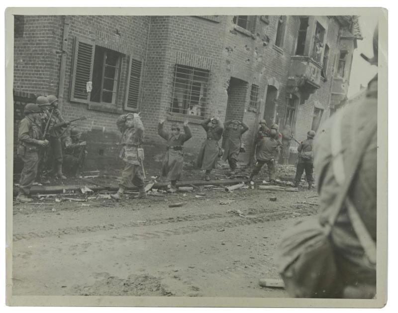 In a very nice condition condition a US Press Photo take in the german town of Geilenkirchen in November 1944.On the picture are US soldiers of the Ninth Army taking Prisoners.The picture comes in a size of 20x25cm.