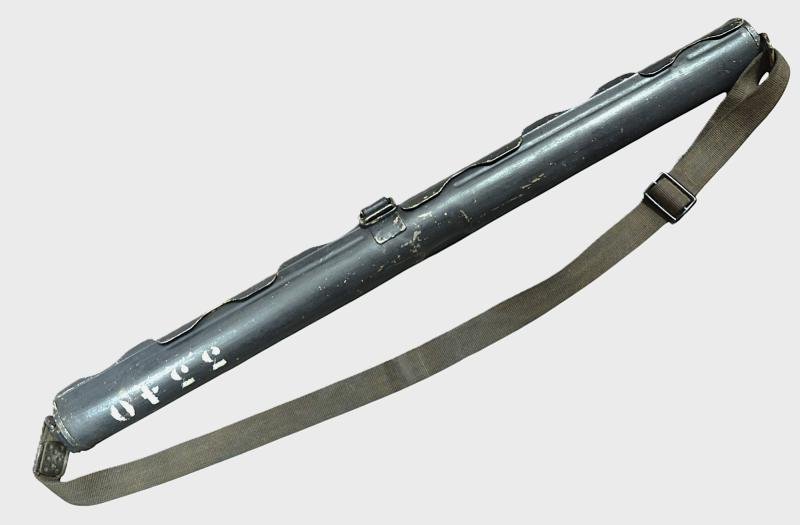 A classic item of infantry field gear being the Spare barrel case . This example was factory finished in the tan / dunkelgelb and then depot refinished in a dark slate grey with gun numbers applied by stencil in an off white . The Grey fine weave shoulder strap is attached with the classic multiple LUX marked fixtures . 1943 marked & dated to one end.