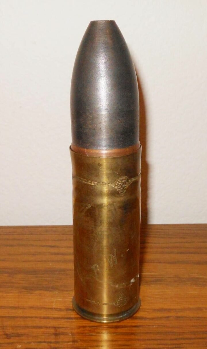 You are bidding on a VERY NICE example of a TRENCH ART WW1 German 3.7 cm AP Round! This was specifically used in the Tankabwehrkanone, Infanteriegeschütz M.15 and Grabenkanone/Sturmbegleitkanone!The 3.7 cm Tankabwehrkanone 1918 in starrer Räderlafette or 3.7 cm TAK 1918, was an anti-tank gun built by Rheinmetall for the Imperial German Army near the end of the First World War. This was the world's first AT gun ever built that was purpose-designed for the role of an anti-tank gun.The 3.7 cm Infanteriegeschütz M.15 was an Austro-Hungarian cannon developed for use in the trenches during the First World War. The name indicates the caliber in centimeters, the gun's role Infanteriegeschütz which in German means infantry support gun and the model according to the year of introduction. Captured Austrian guns and Italian produced copies were first designated Cannon 37F and later as 37/10 F. Mod. 1915 in the 1930s.The 3.7cm Grabenkanone – literally 'trench gun'. Designed by Krupp, utilising 'offspring of the old five-barrelled Gruson revolving guns… when it was replaced by the single shot quick-fire 5cm case mate gun'. Mounted on a U-shaped beam with two different shield options: one (13mm thick) for firing from an enclosed position; larger shield for firing from an open position. The gunner could use a small mirror on the side to observe fall of shot! Smaller version could be manhandled.The 3.7cm Sturmbegleitkanone – designed by Krupp, also based on the tubes of 3.7cm revolving gun. The shield was in four parts and the trail held 2 planks for crossing ditches, etc. It fired 3 types of projectile: impact fused shells (anti-infantry, blockhouses), canister (48 13g balls), and bombs launched in high angle mode like a minenwerfer.Made of brass and steel, this Veteran-Made TRENCH ART is a FANTASTIC piece of history!Completely inert, there are some very slight wear and marks, however it remains VERY SOLID with much of the original paint and finish!The veteran inscribed his initials, as well as 'AEF FRANCE' into the side. He also added some scroll work/floral motif. The brass case features all the original markings, including 'PATRONENFABRIK KARLSRUHE 1918'. A SUPERB addition to any collection or display!Please email me if you need additional photos or information.