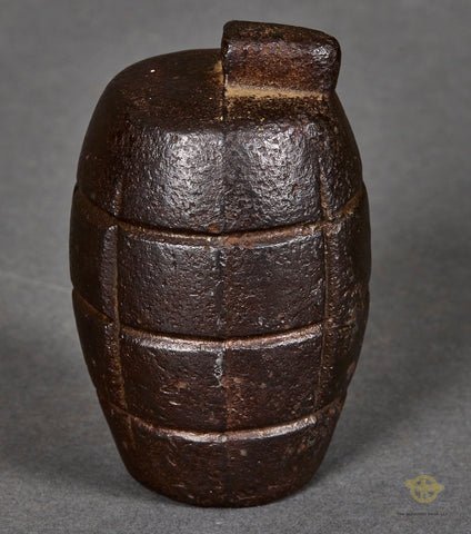 Novelty Paperweight in Shape of a Grenade-We are unsure if this is a practice grenade, or if it was made as a novelty paperweight. We cannot find any research on this, but it is a fun piece. This is solid iron, and crafted in the shape of a fragment grenade. It weighs 1.8lbs or .81kg.It is quite heavy, so would make a cool paperweight or display piece for your shelf. It is not marked at all. Priced to sell.