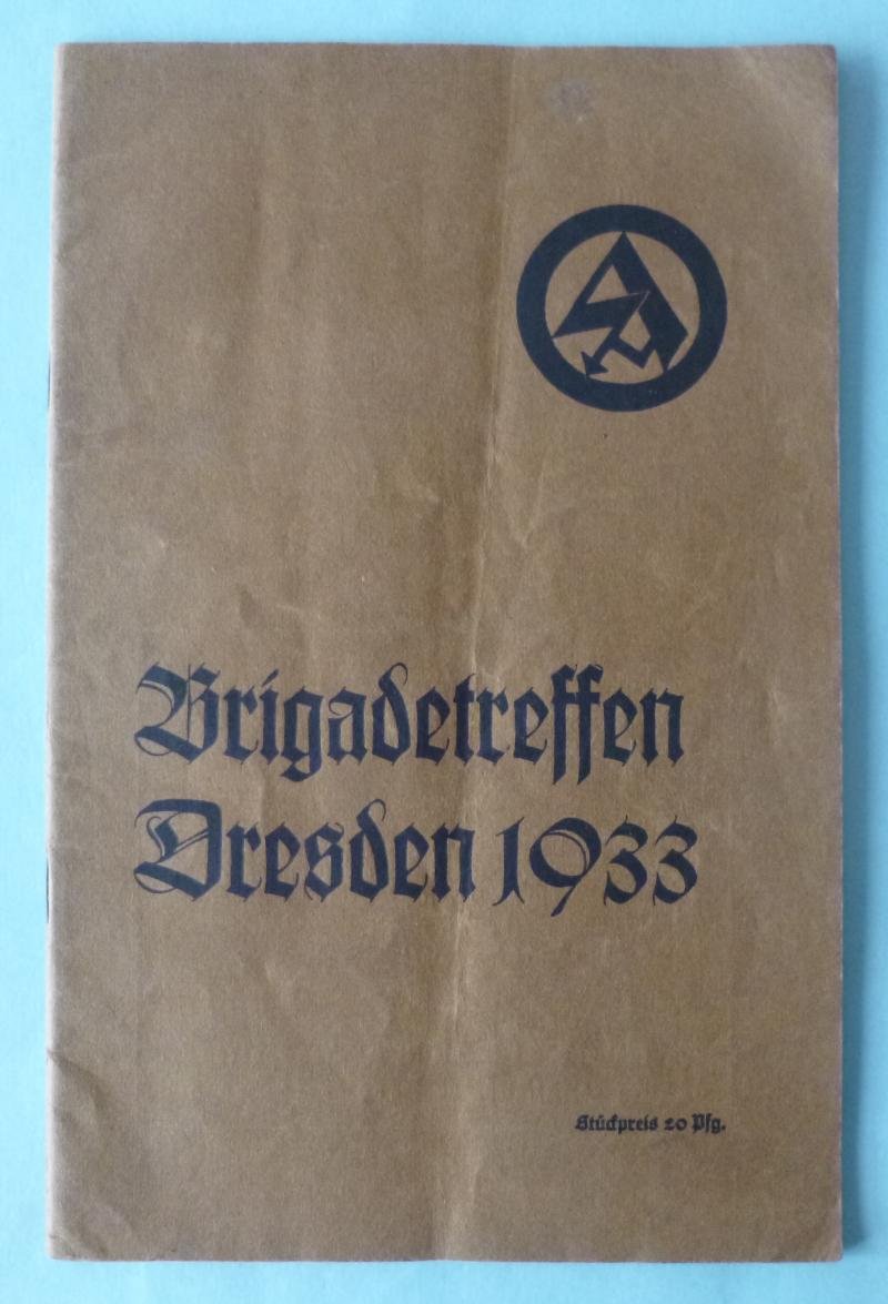 Original brown card-backed A5 forty-page programme/booklet for the September 1933 weekend rally meeting of SA-Brigade 33 of Dresden. The booklet contains eighteen photos of individuals from Hitler and Röhm down through all the brigade's chain-of command to commanders of the Standarten (regiments). There is a history of the Brigade, write-ups on each regiment, a detailed programme for the weekend's activities plus 22 sides of period advertisements.The booklet is complete, undamaged and in excellent condition apart from having once been lightly folded (see pictures)A very scarce early piece for the serious SA collector.