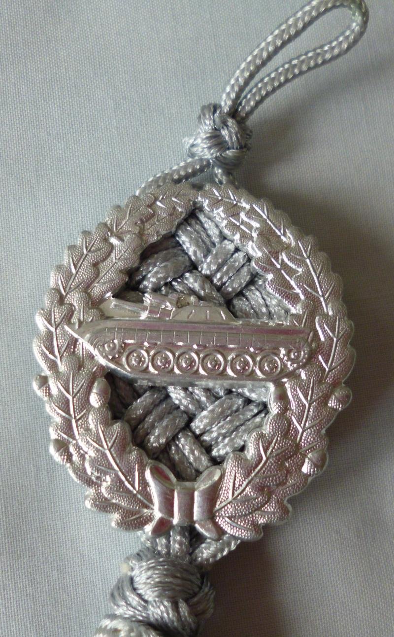 Silver-grey plaited lanyard with aluminium badge showing a Soviet BMP armoured personnel carrier within an oakleaf wreath.Awarded only to non-commissioned ranks for small-arms marksmanship, awards ceased with the demise of the DDR in 1990.Top condition from my personal collection.