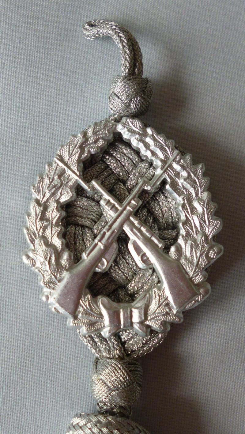 Silver-wire plaited lanyard with aluminium badge showing crossed rifles within an oakleaf wreath.Introduced in 1957 and awarded only to non-commissioned ranks for small-arms marksmanship, the first awards were made in 1958 to 305 soldiers. Awards ceased in 1990 with the demise of the DDR.Top condition from my personal collection.Three available.....price each.