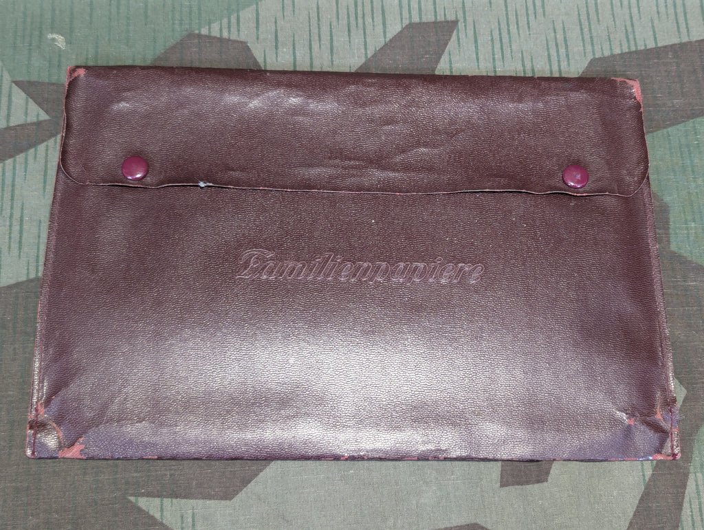 Familienpapiere envelope. A place to keep your all important family papers, which you would often need in order to get married or to advance at work or even to obtain certain promotions within the military.AS-IS.It is a little bit on the brittle side with a few worn flaky spots in the oil cloth around the edges and folds.