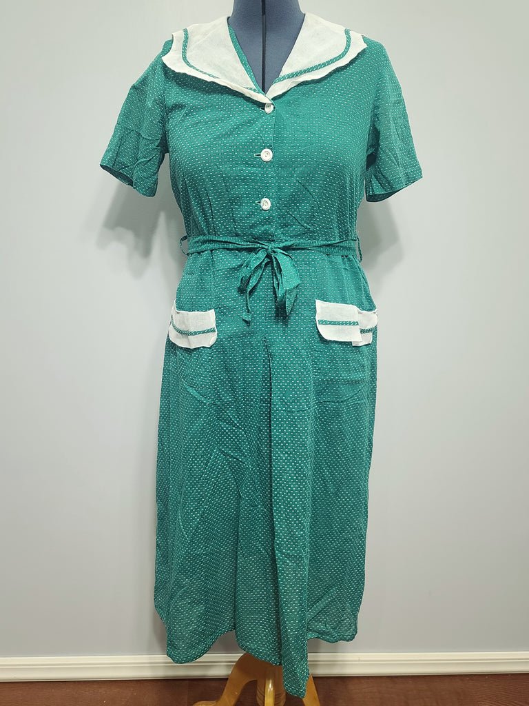 Vintage 1930s / 1940s green polka dot dress with white trim and matching belt.MEASUREMENTS (approximate):Bust- 42'Waist- 36'Hips- 41'Length- 46'The dress is a green color; the photos make it look more blue than it really is! Lightweight summer dress that is a bit see-through so you will need a slip underneath.AS-IS condition. The dress is a bit delicate and has a lot of repairs. There are small holes along the white collar. A repair and a hole on the top corner of one pocket. The center front seam has some repairs as well. Many small holes were repaired with mending tape (I took a photo of the dress inside out to show all the mended spots). There is some wear / discoloration areas where the white polka dots have rubbed off. Loose stitching by one button and in a few other areas.