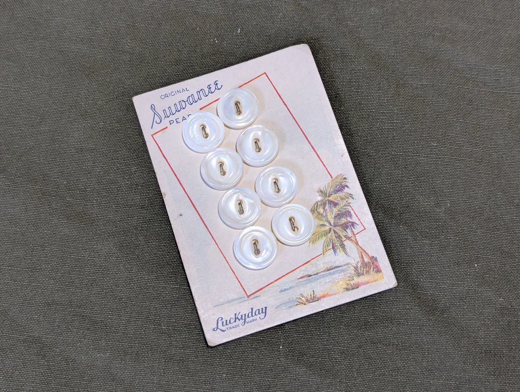 Vintage Original Swanee Pearl buttons on card. Would be good for men's or women's dress shirts or possibly on a nurse uniform. Good condition. 8 buttons on the card.