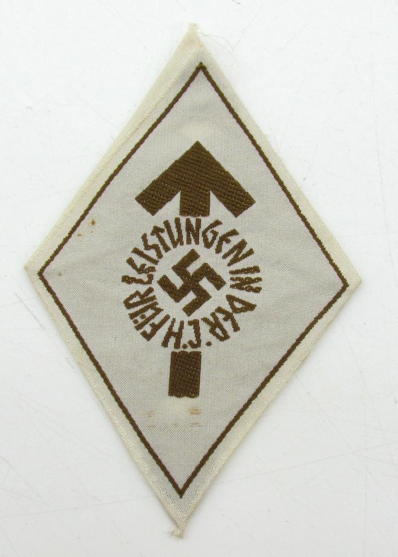BeVo-woven cloth version of the Hitler-Jugend Proficiency Badge in Bronze (HJ Leistungsabzeichen in Schwarz) - 'Für Leistungen in der HJ'.This cloth version was intended for wear on the HJ Sport Shirt. The badge is nicely woven in the so-called BeVo-weave.in uniform removed and extremely fine condition.