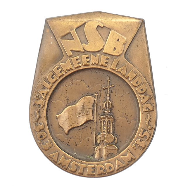 NSB '3e Algemeene Landdag Amsterdam' Tinnie.This event was held at 30 March 1935 in Amsterdam. The Dutch 'Nationaal-Socialistische Beweging' (National Socialist Movement) was founded by 'Anton Mussert' in December 1931 and was a Dutch pro-German Nazi Party. The tinnie comes on its functional pin/catch system, the tinnie is not visible maker marked. Nice original early NSB tinnie in very good condition!