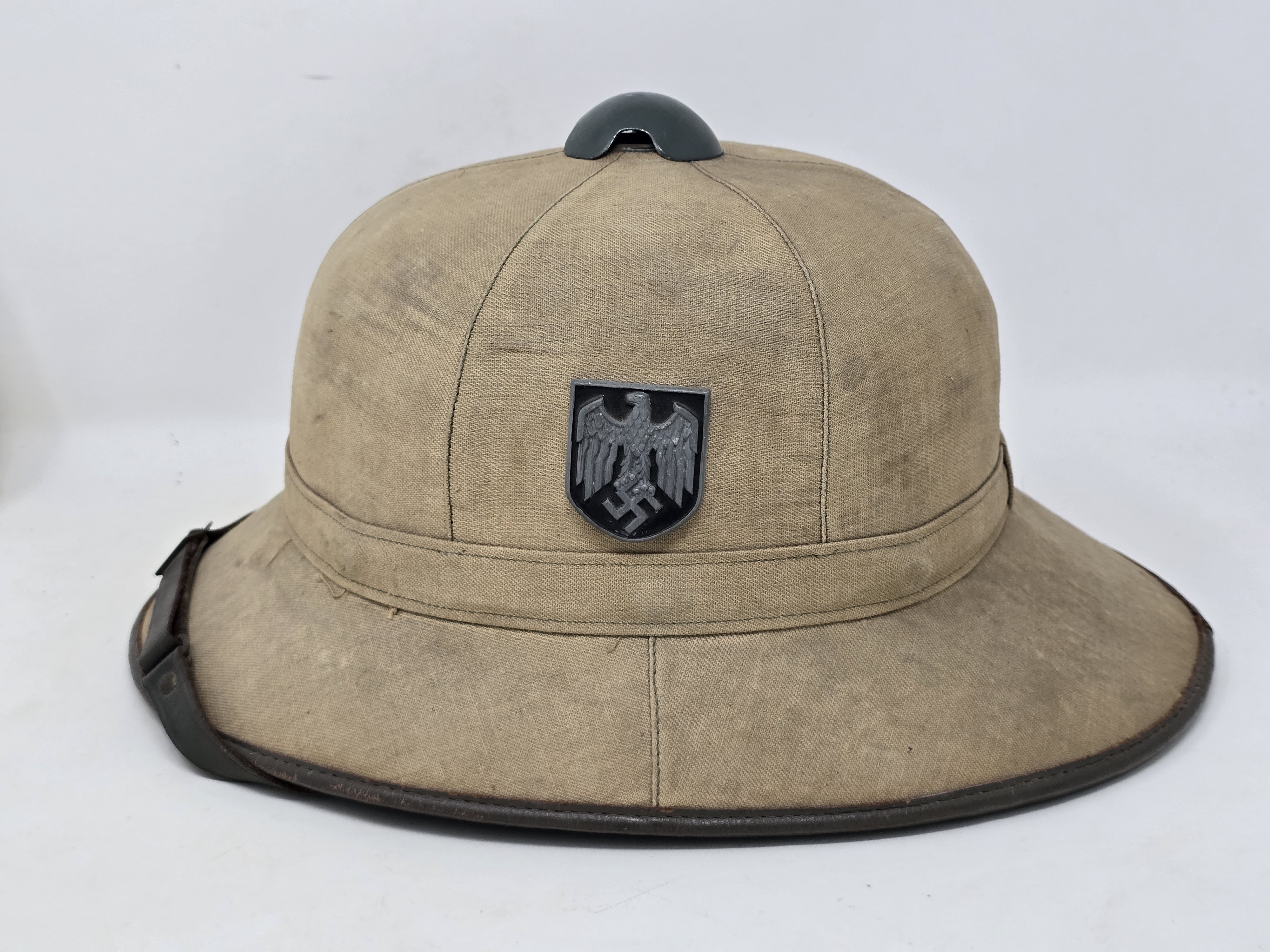 This is a decent example of a DAK pith helmet for Heer. The condition throughout shows moderate to light service use. The insignia have been re-badged at one point, and the air vent cover is painted feldgrau. Overall a nice looker for the DAK display!