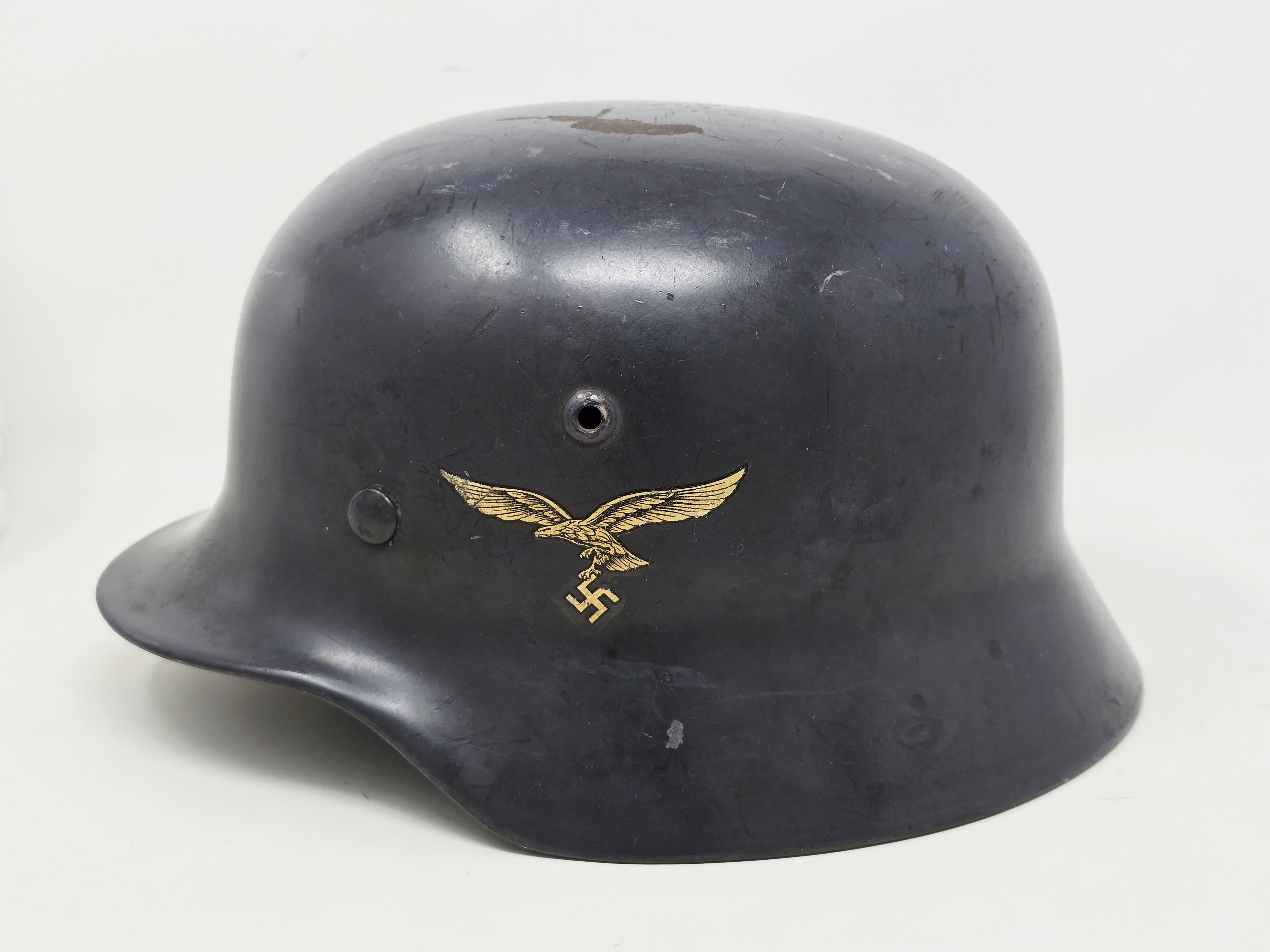 This is a fine example of the iconic LW M35 by Quist, #2708. The helmet features ~92% Luft Blue-grey finish, and nearly 100% Luft adler and national shield. The liner is light golden and shows moderate service use (string is replaced). The correct issue strap is the kidney-bean brown, proper Luftwaffe strap, LBA and maker marked Paul β- Wien; but date faded (likely 1938-9). Top shelf Luftwaffe M35 for the collection. COA accompanies.