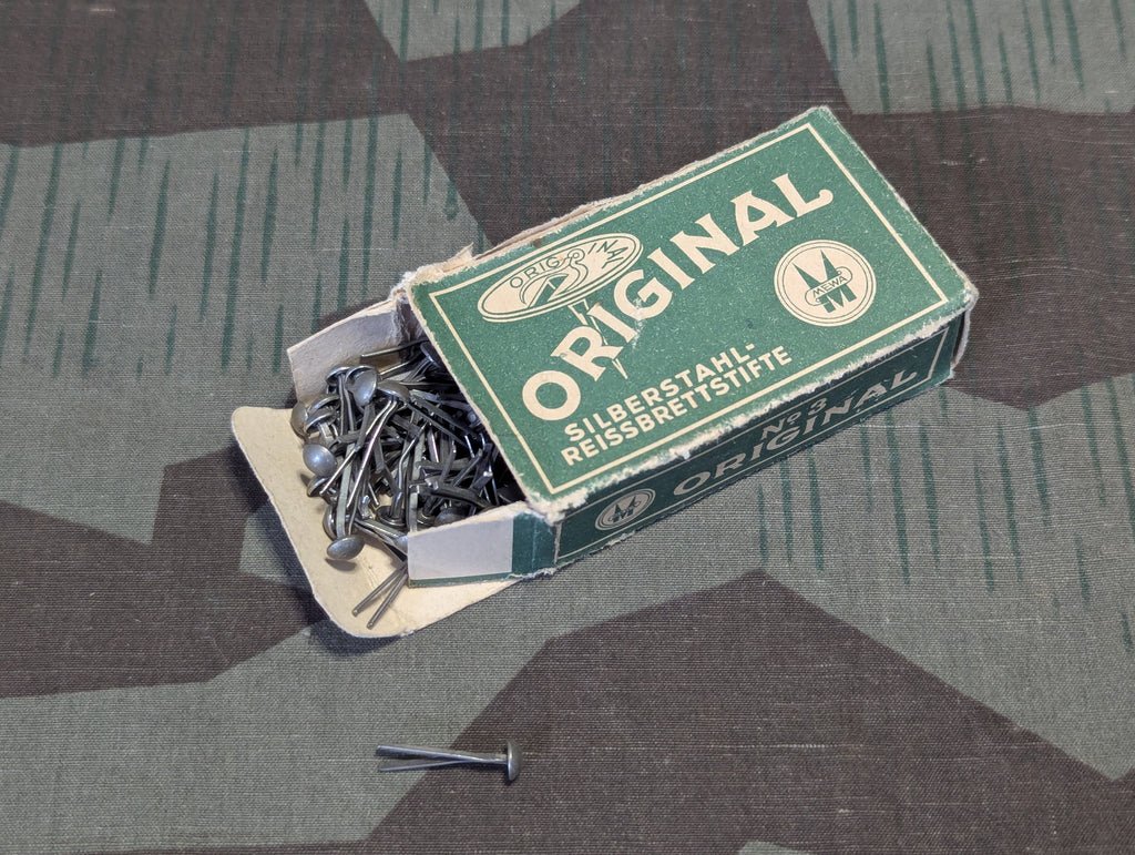 Original box of office split pins. The box seems to have been for thumb tacks but these split pins were what was in it. It seems a bit unlikely that someone put them in it later. The box is a little rough but still in one piece. I am not sure how many pins are inside, but there are quite a few.