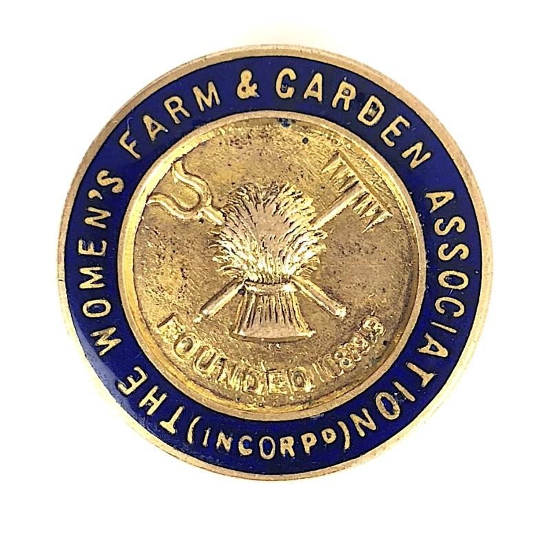 A scarce circa 1929 period 'Womens Farm & Garden Association Incorporated badge'; gilt circular example with blue enamel title surround, the centre depicting an embossed wheatsheaf superimposed on crossed pitchfork and hay rake with 'Founded 1899' below; the reverse impressed with maker's details 'W.O. Lewis (Badges) Ltd Birmingham'. Very good condition, complete with original pin fittings, no damage to the enamel. Diameter approx 25mmThe Women's Farm & Garden Association Incorporated' was first established in 1899 as 'The Women's Agricultural and Horticultural International Union' the name was changed to 'The Women's Farm and Garden Union in 1910 and to the Women's Farm and Garden Association in 1921, with the additional 'Incorporated' added in 1929. The society was responsible for the establishment of the 'Women's National Land Service Corps' in the First World War, which was taken over by the 'Board of Agriculture' in 1917.