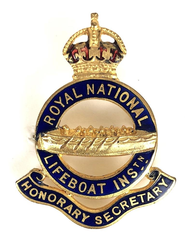 A scarce original circa 1940's period 'Royal National Lifeboat Institution Honorary Secretary badge'; large gilt metal blue enamel title circlet surmounted by a King's crown, the voided centre depicting an embossed lifeboat with full crew with blue enamel 'Honorary Secretary' scroll below; the reverse impressed with maker's details 'W.O.Lewis (Badges) Ltd B'Ham'. Very good condition, complete with original pin fittings, no defects to the enamel, gilt finish remains bright, an excellent example.Height approx 41mm.