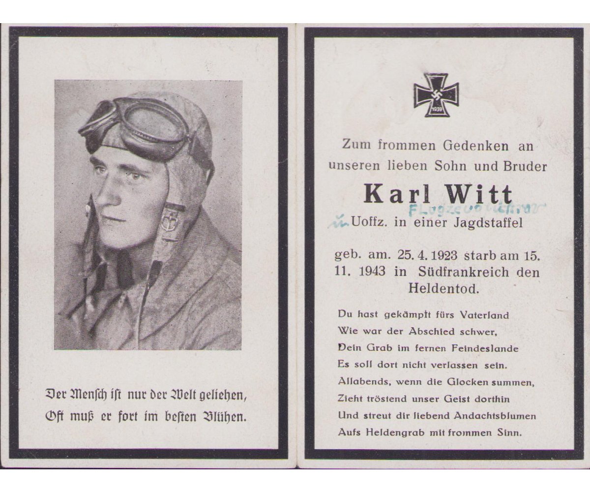 Death notice of Karl Witt who died on the 15th of November 1943 in the south of France.