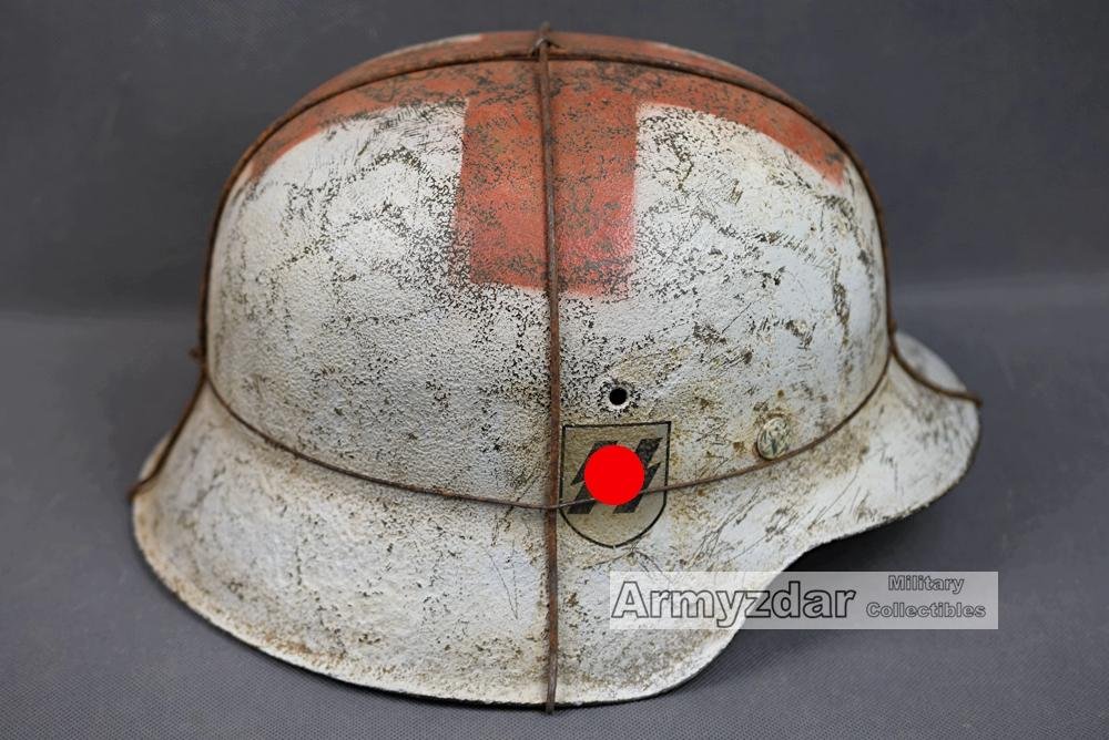 This is a high quality reproduction of WW2 SS M40 double decal helmet. The helmet shell is original war production, but paing and liner are new. The helmet was perfectly aged to look like original.Size 66/59