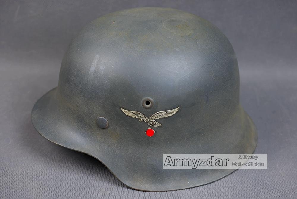This is a high quality reproduction of WW2 Luftwaffe helmet. The helmet shell is original war production, but paint and liner are new. The helmet was perfectly aged to look like original.Size: 64/57