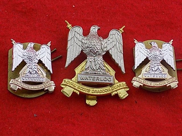 .Cap badge & Pair Collars - Royal Scots Dragoon Guards, gilt brass and white metal, slider fitting on cap badge, lug fitting on collars, good condition