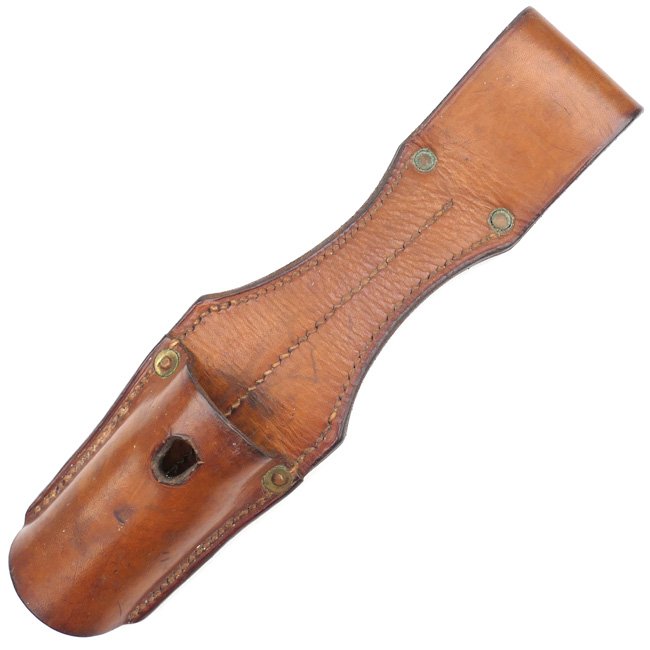 Light-brown K98 Bayonet Frog (Seitengewehrtragetasche). The K98 bayonet was a standard issue item and was accompanied by a bayonet frog to be worn on the reverse left side of the load carrying waist belt. The K98 bayonet remained the standard issue bayonet through-out the war with minor manufacturing variations. The bayonet frog is made of high quality light brown leather. The frog is not visible maker marked but is showing characteristics for production by the company of 'J. de Valk' from Amsterdam. Nice original example in good used condition!