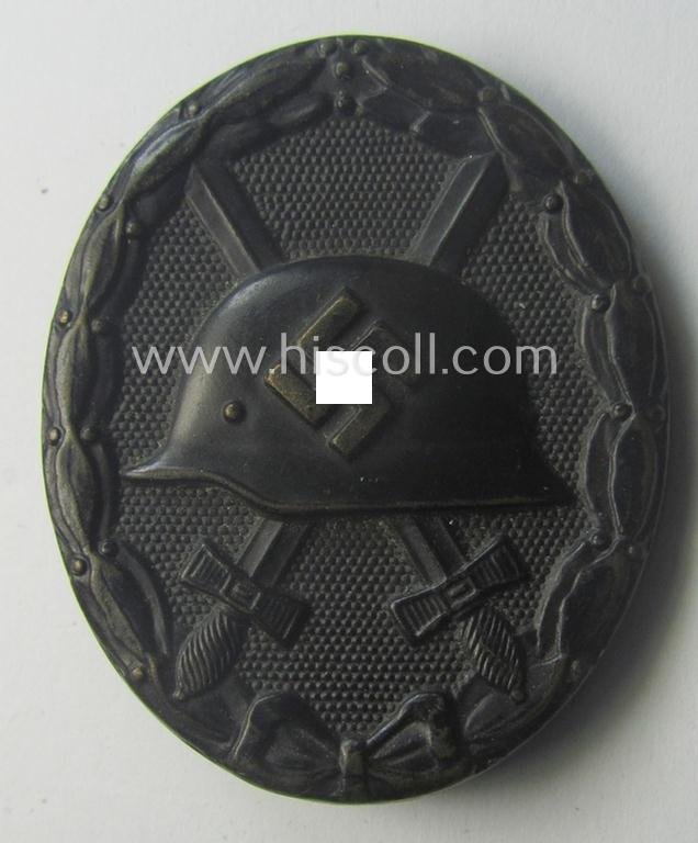 The attractive - albeit minimally used- and/or worn - black-class wound-badge (ie. wound-badge (or: 'Verwundeten-Abzeichen in Schwarz') truly retains most of its original, black-coloured- and/or somewhat 'shiny'- (ie. satin-like-) finish: it only shows just moderate wear and was simply nicely preserved over the years. The (typical non-magnetic) wound-badge is - as stated above - neatly maker-marked with the makers'-designation: 'L/11' (as is clearly visible on the back of the badge as can be seen on the pictures) signifying that it deals with a piece that was produced by the desirable 'Wilhelm Deumer'-company as was based in the town of Lüdenscheid. Of course, are the (regular- ie. thin-shaped- and/or also non-magnetic) pin and/or: (typical) catch (-set-up) fully functional and of course present. This piece has never been cleaned nor polished: it shows some minimal dust and/or minimal (rust) staining as mentioned above. Hard to find a more nicely preserved and just moderately used example for a more interesting price!