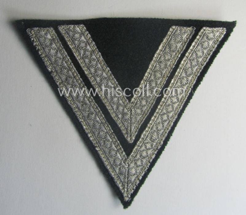 This is an attractive - and I deem simply never used! - example of a WH (Heeres) 'Armwinkel' (ie.: arm-chevron) as was executed on a typical, darker-green-coloured- and/or woolen-based background as was intended for usage by a soldier with the rank of: 'Obergefreiter' (ie. private first-class) and that comes in an overall very nice- (and I deem simply never used- ie. still 'virtually mint'-), condition. The chevron is neatly executed and shows a double stripe of (bright) silver-coloured- (ie. non-'sub-dued') and/or 'standard'-pattern NCO-braid attached (as can be seen on the pictures). The piece is void of any backing (as can be seen on the pictures). It sounds maybe strange but these 'simple' Heeres-related rank-insignia are quite hard to encounter. Simply an attractive WH-rank-badge that is I deem accordingly priced!
