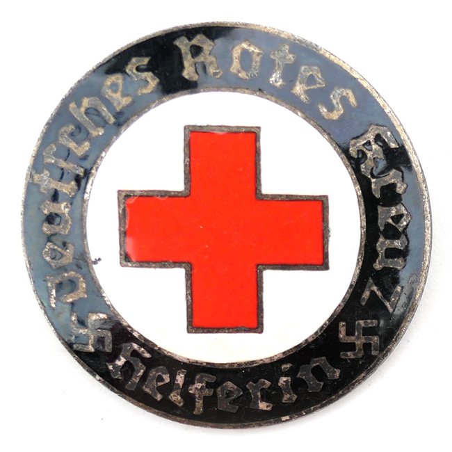 German Red Cross (Deutsches Rotes Kreuz) 'Helferin' brooch as intended for nurse assistants. This is a nice black/white/red coloured enamelled brooch in good used condition, it shows some normal damages and scratches caused by usage. Nicely marked with 'Ges.Gesch.' on the back. It comes on its original and functional pin/catch construction. Nice example in good condition!