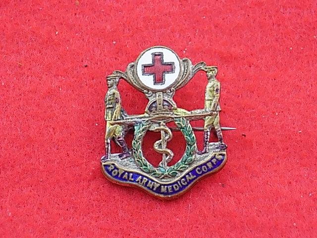 .Pin Badge - Stretcher Bearers - Royal Army Medical Corps with Kings Crown, brass with red, blue and green enamels, pin fitting to rear, approx 30mm x 24mm, good condition