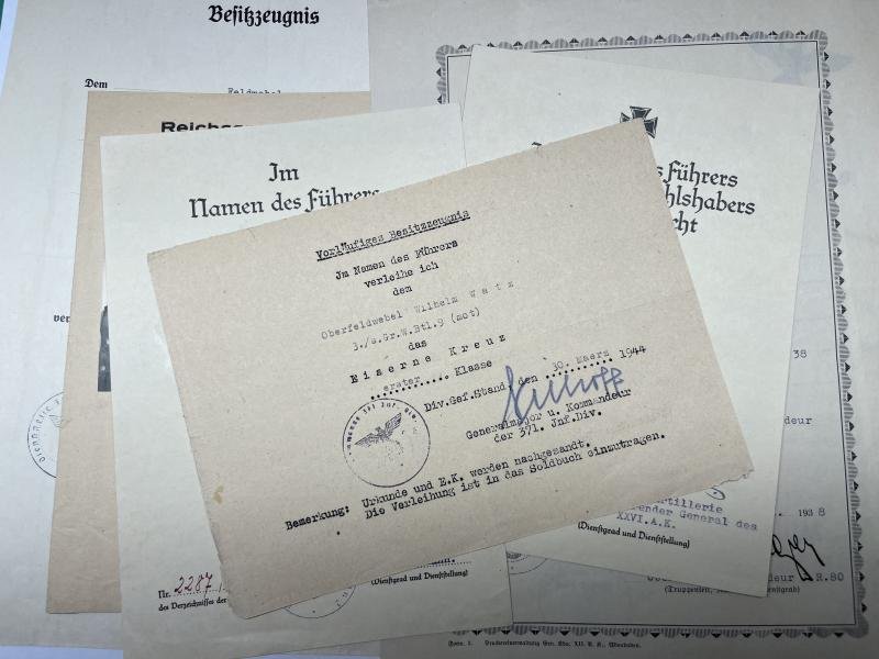 Citation grouping of 'Oberfeldwebel' Wilhelm Watz who served within divers units.1) 'Dienstauszeichnung IV. Klasse' which has been signed by 'Oberst' and regimental commander of Inf.Rgt.80 (34.Inf.Div.) ,Rudolf Wanger (late 'Generalleutnant' and commander of the 234.Inf.Div./417.Div.)2) 'Deutsche Schutzwall-Ehrenzeichen' citation of Watz which was issued at Wiesbaden (Wehrkreis XII)3) EK II citation which has been handed out during the 'Westfeldzug' (France) of 1940 and has been Albert Wodrig (RK 19-7-1940,DKiG 22-4-1942)4) A4 size 'Sturmabzeichen' citation which has been issued in 'Afrika' and which has been signed by 'Generalmajor' and divisional commander Johannes Streich (RK 31-1-1941)5) A4 size BWB citation for Watz being wounded at 'Tobruk' (Libya) which has been issued in 'Afrika' and which has been signed by the commanding officer.6) 'Ärmelband-Afrika' (africa cuff title) citation which has been signed by the commanding officer of schwere Granatwerfer Btl.9 (mot)7) Preleminary EK I citation which has been signed by 'Generalmajor'and commander of the 371.Inf.Div. ,Hermann Niehoff ('Ehrenblattspange' 29-9-1941 ,DKiG 6-1-1942 ,RK 15-6-1944 ,EL 5-3-1945)!!