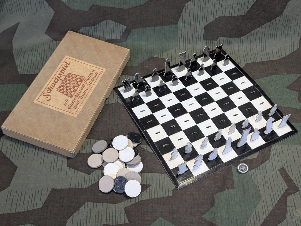 Original boxed chess/checkers game set. The chess pieces are designed to stick into the board so the piece won't fall off. Ideal for long train rides to the front. It is basically new old stock showing some minor age on the box. These were a common feldpost item to send.