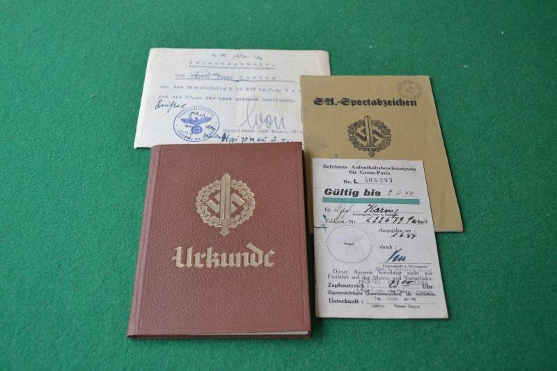Four items to the same man being, SA sports badge book for the bronze class dated 1939, SA sports badge record book, limited residence permit for Greater Paris and a leave authorisation pass for Avignon, nice clean group.