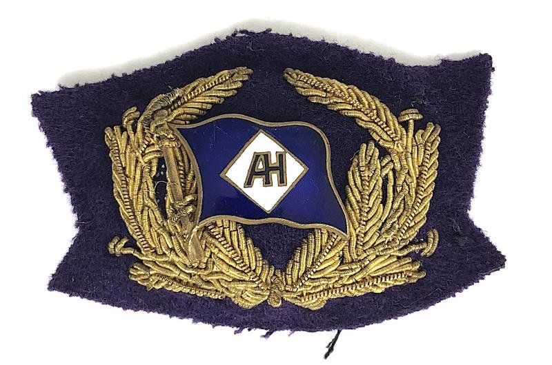 A scarce original post 1902 early 20th century Edwardian period 'Alfred Holt shipping line cap badge', the Company's gilt brass flag inlaid with blue enamel to the centre, bearing a white diamond with 'AH' monogram, this mounted upon a small gold bullion wreath with purplish blue felt backing, the reverse with black hessian paper lining. Very good condition, no damage to the enamel.Size approx 65 x 43mm.