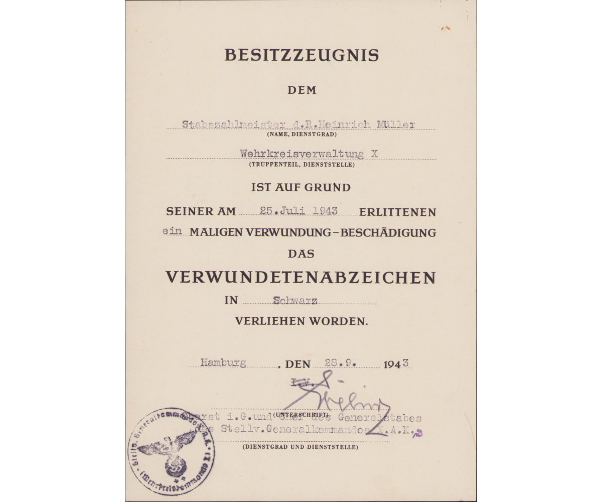 Very nice Wehrmacht Wehrkreisverwaltung X related Verwundetenabzeichen in Schwarz award document in used, but very good condition.
