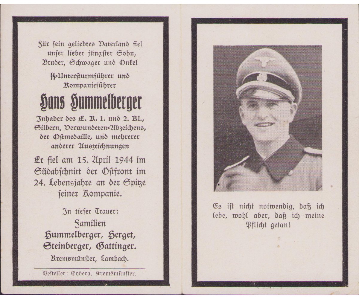 Death notice of Hans Hummelberger who died on the 15th of April 1944 in the Ukrain area of Tarnopol.