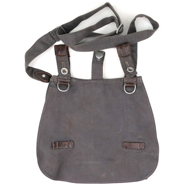 Luftwaffe Bread Bag Model 1931 & Strap (Brotbeutel mit Brotbeutelriemen). Bread bags were widely utilized by all German military and non-military organizations, so various models and colors were produced. The bread bag was worn attached to the belt on the right side of the back. The blue-grey coloured canvas construction breadbag is re-inforced with chocolate brown leather parts. The breadbag is faintly maker marked and showing a 'L.B.A.' marking, there is also a nice unit marking for a 'FLAK Regiment', see photos. The bread bag is complete with matching carrying strap, nicely marked and dated 1939 as well. Nice original Luftwaffe bread bag in very good condition!