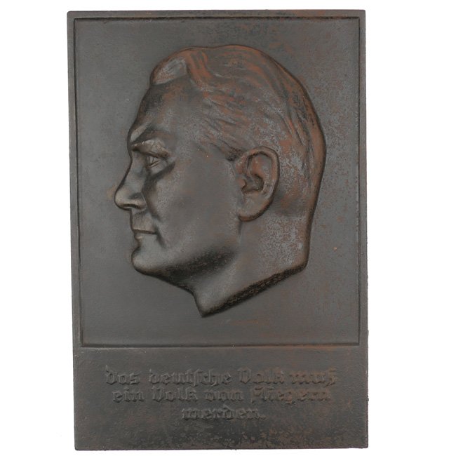 This is a nice original period wall relief picture of 'Hermann Göring'. The cast iron plaque measures approximately 33 x 22 cms. The plaque is marked with Göring's motto: 'Das deutsche Volk muss ein Volk von Fliegern werden' (The German people must become a people of Aviators), the plaque is marked by designer 'W.Wolff' in 1935. The plaque is in good used and uncleaned condition showig some light surface rust, see photos. Unlike Adolf Hitler's plaque, Hermann Göring's plaque is extremely rare and almost impossible to find. Nice and decorative original piece!