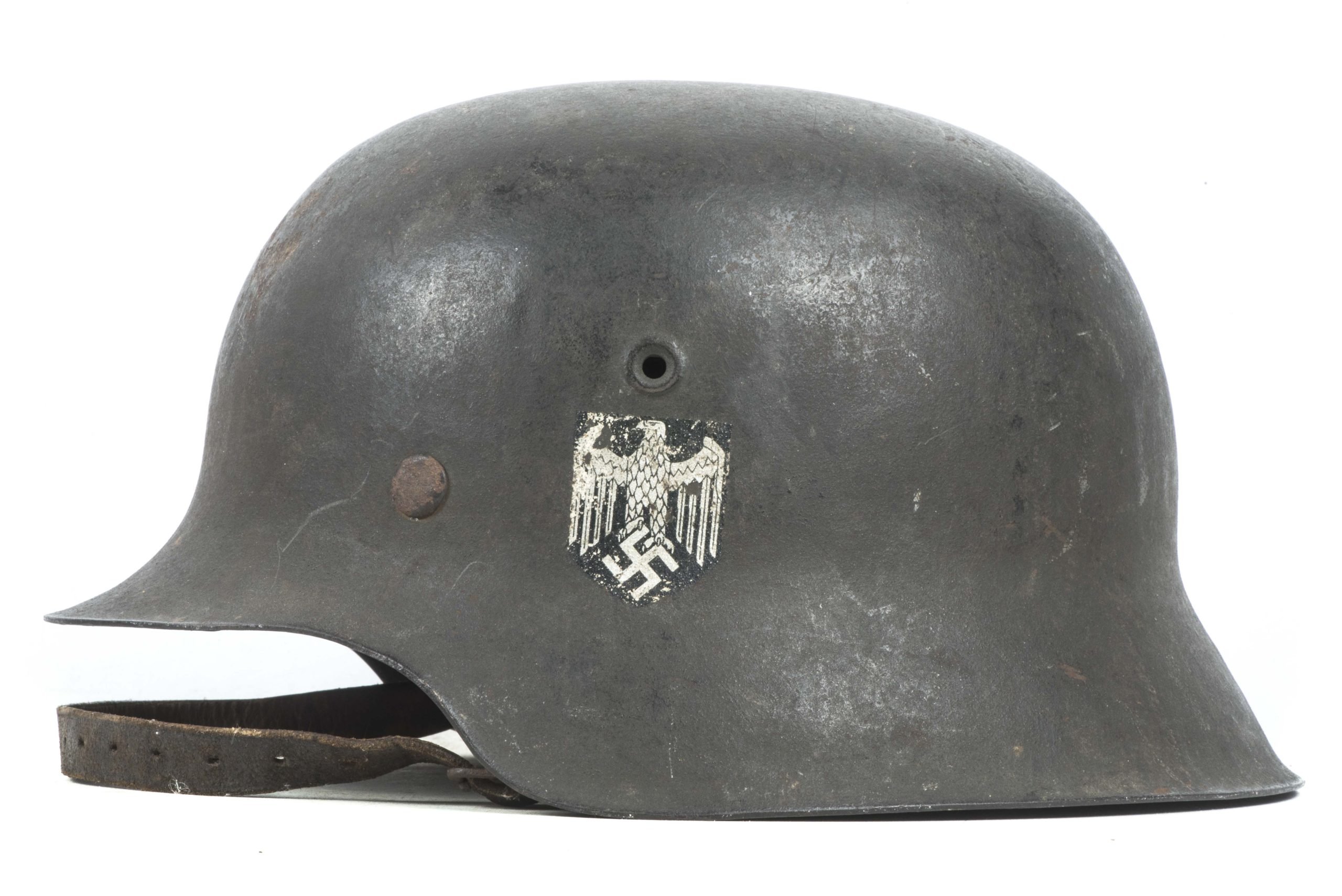 Textbook Heer M42 helmet marked EF64 indicating production byEmaillierwerke Fulda. The helmet retains its original textured factory finish and decal. The helmet retains its original RBNR marked chinstrap and factory installed liner. Nice example in good condition!