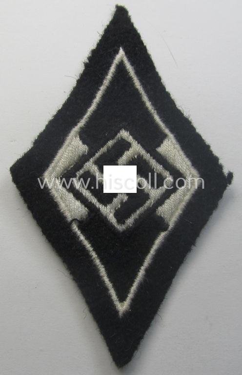 Waffen-SS-pattern, machine-embroidered and/or black- and white-coloured sleeve-insignia (ie. 'Ärmelraute') depicting a so-called: 'HJ-Raute' as was used and intended to signify former membership within the 'Hitlerjugend'