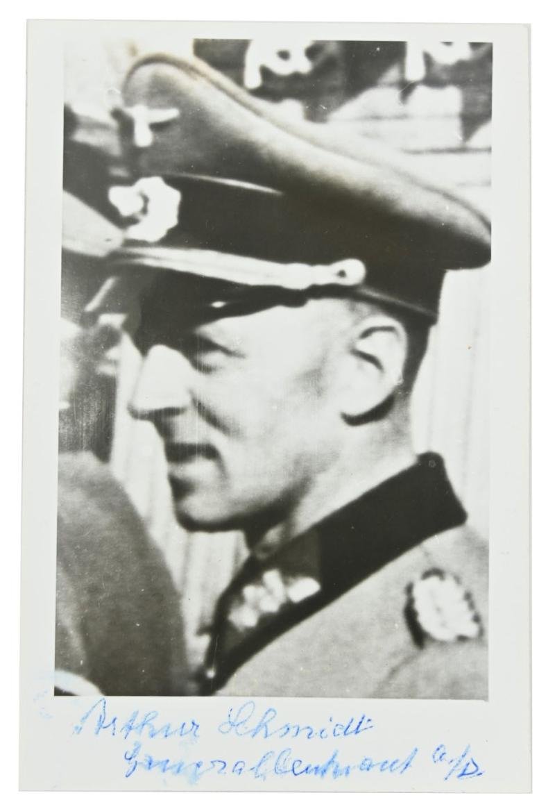In a very nice condition an original signature on a postwar picture of Wehrmacht Generalleutnant Arthur Schmidt.Arthur Schmidt earned the Knight's Cross of the Iron Cross on january 6th 1943 as member of the Generalstab of the 6th Army.Arthur Schmidt (25 October 1895 – 5 November 1987) was an officer in the German military from 1914 to 1943. He attained the rank of Generalleutnant during World War II, and is best known for his role as the Sixth Army's chief of staff in the Battle of Stalingrad in 1942–43, during the final stages of which he became its de facto commander, playing a large role in executing Hitler's order that it stand firm despite being encircled by the Red Army. He was a prisoner of war in the Soviet Union for twelve years, and was released following West German chancellor Konrad Adenauer's visit to Moscow in 1955.