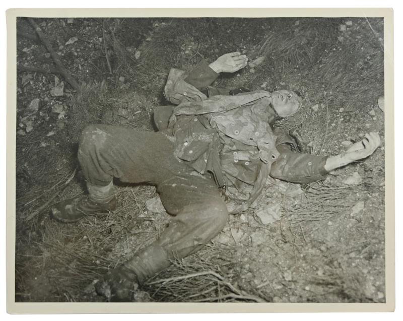 In a very nice condition a US WW2 Press Photo of a dead german soldier at Hill 187 at Volkenrath Germany.The picture comes in a size of approx 20x25cm.