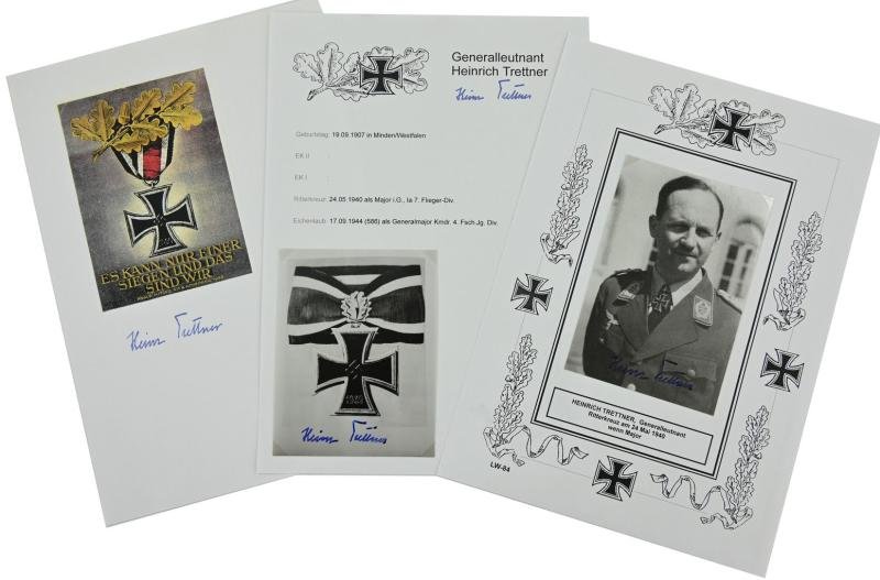 In a very nice condition a original signature on a postwar picture of Heinrich Trettner.Generalmajor Heinrich Trettner earned the Knight's Cross of the Iron Cross on May 24, 1940 as Major im Generalstab of the 7. Flieger-Division and the Eichenlaub on September 17, 1944 as Generalmajor und Kommandeur of the 4. Fallschirmjäger-Division.The picture comes with extra picture and signatures.