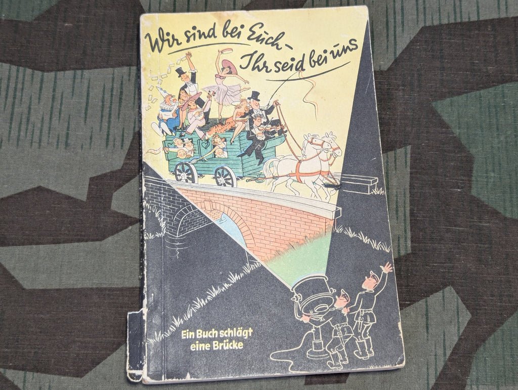 Wir sind bei Euch - Ihr seid bei uns We are with you - You are with us. A book with greetings from actors and actresses to the fighting men on the front. Printed in 1941. There are a fair few pictures, cartoons, and personal messages. Some tears on the spine and overall general wear.