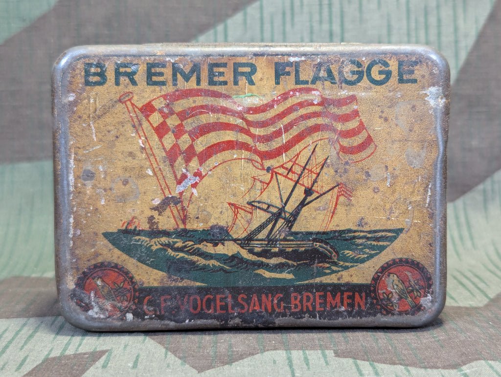 Original German loose tobacco tin, Bremer Flagge. Its pretty worn, but still has a fair amount of the original graphics. Some rust.