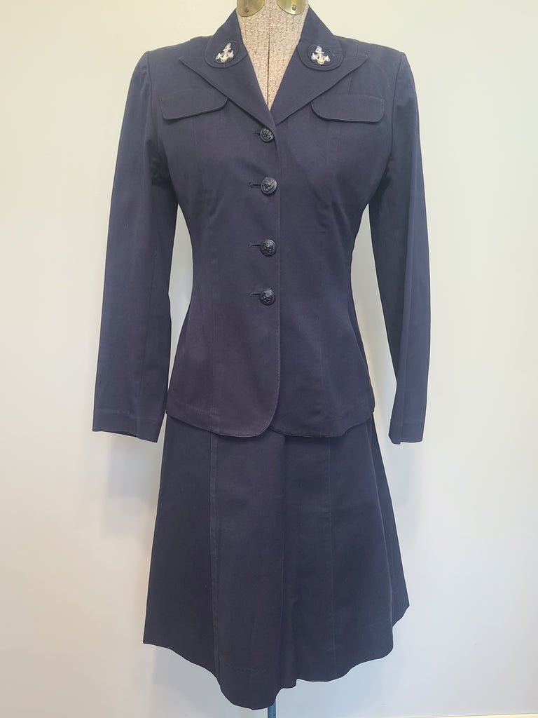 Original WWII first pattern WAVES summer enlisted uniform jacket and skirt. One of the rarer uniform pieces - only used in the summer of 1943. The set doesn't come up often.MEASUREMENTS (approximate):JACKET:Bust- 34'Waist- 29'Length- 23'Sleeve(shoulder seam to end of cuff) - 23'SKIRT:Waist- 23'-24'Hips- 34'Length- 25'Both pieces are named to Audrey J. Kelly. It has the blue 'Made and sold under the authority of the U.S. Navy U.S. Women's Naval Reserve' tag. Women's Naval Reserve label in the inside pocket and on the skirt waistline. The detachable shank buttons are held in place byround wire loops. Some light wear and smudges. Side metal zipper. Some loose stitching.The set is in good condition. This lighter weight material was made as an alternative to the wool for summer. However, it proved to be unpopular so it was abandoned.