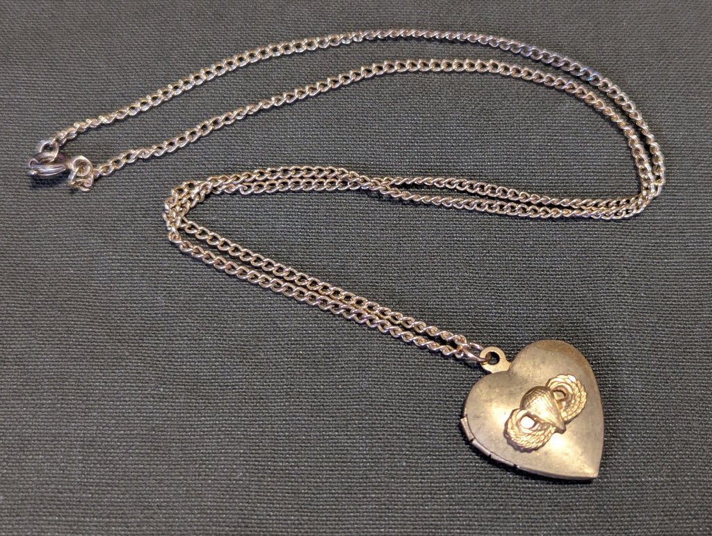 Vintage WWII sweetheart airborne paratrooper jump wings heart locket necklace. It is unmarked and in fairly good condition. There is some light discoloration.