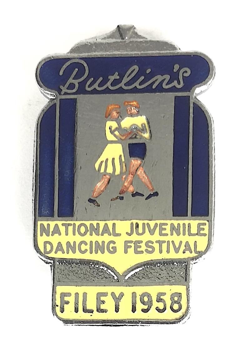 A scarce original 'Butlin's 1958 Filey National Juvenile Dancing Festival badge', chromium plated enamel example, the reverse impressed with maker's details 'W.Reeves & Co Ltd B'Ham'. Very good condition, complete with original pin fittings, no damage to the enamel.Height approx 36mm.