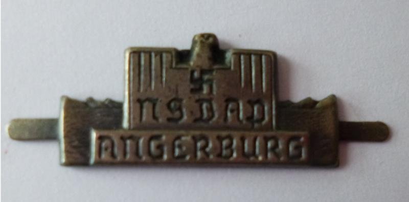 Stamped silver-grey metal eagle with swastika and 'NSDAP Angerburg'. Overall width 35mm. The reverse has a knurled stick-pin. Excellent condition.Angerburg was in East Prussia.